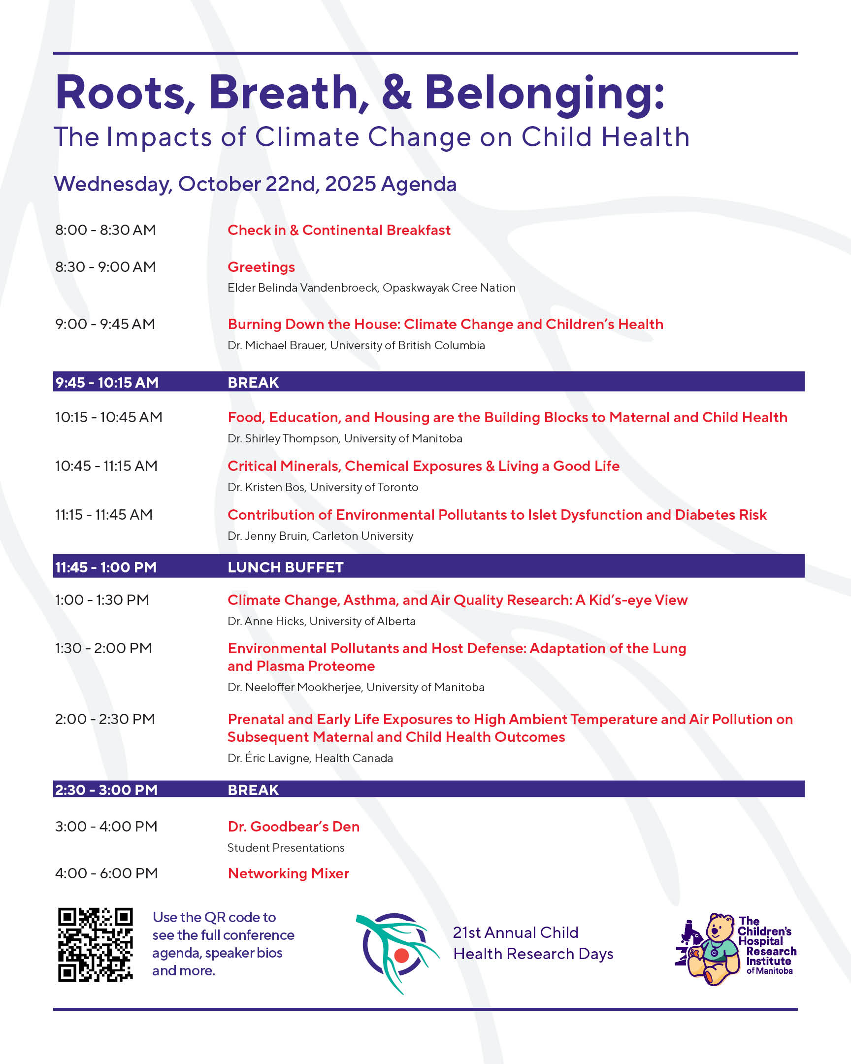 The second day will begin the conference in full force, with seven speakers delivering talks discussing the land and air impacts of climate change on child health. In the evening a networking mixer will occur on the Leaf Mezzanine.
